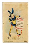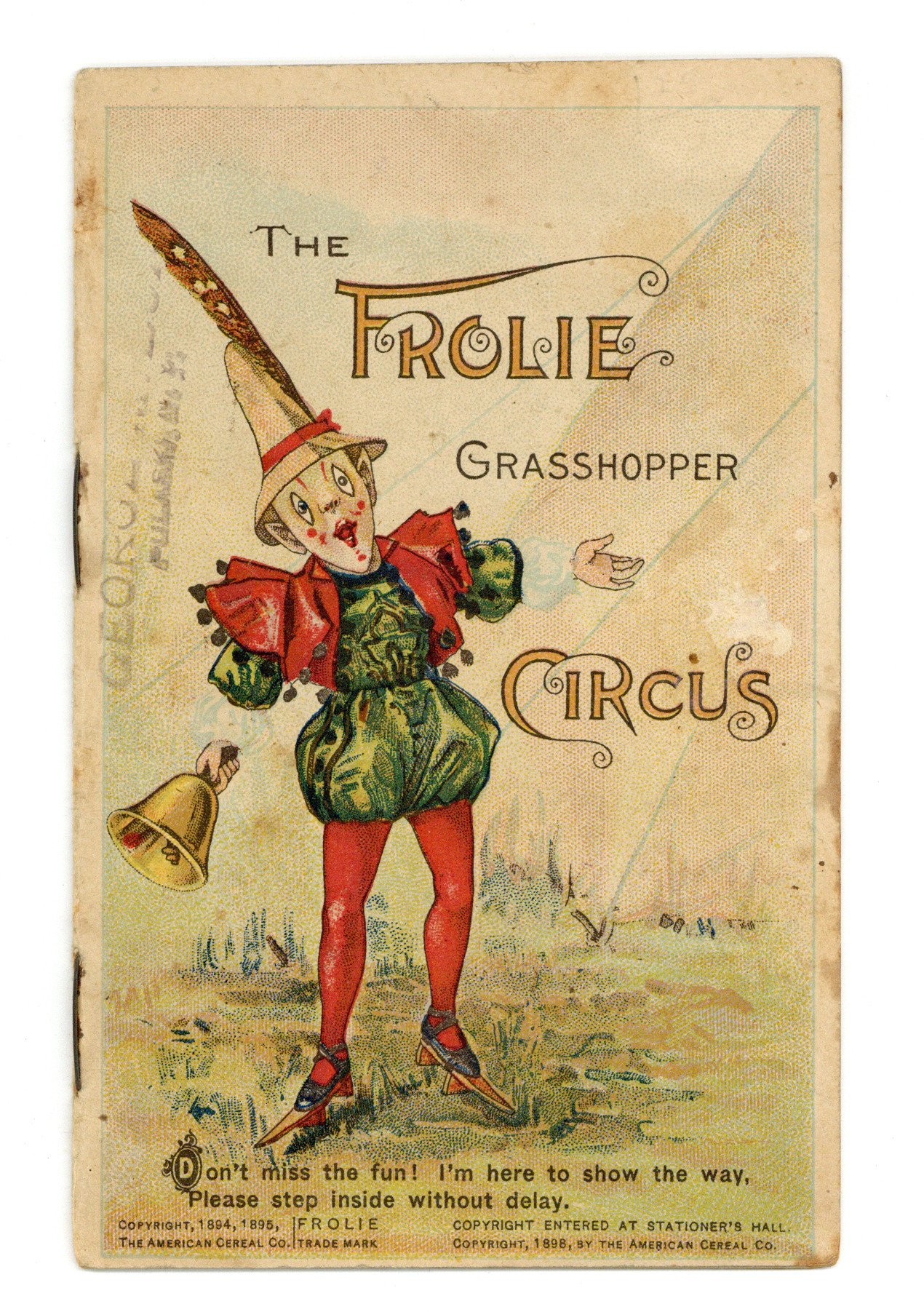 Quaker Oats mini advertising booklet. Each page has rhyming verse and is beautifully and colorfully illustrated with a depiction of a clown(s) and a grasshopper(s) performing feats of strength, balancing acts, trapeze flying, and other circus skills. They typically depict the clown(s) or grasshopper(s) handling a box of Quaker Oats. 3 1/2-in. x 5 1/2-in., 16 pages, full color. Cover price $0.02.