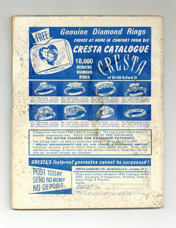 Published 1966 (est.) by IPC/Fleetway.$4.49- Front cover detached 5%. Back cover detached 5%. Water damage: Extensive. Staple rust: Moderate.