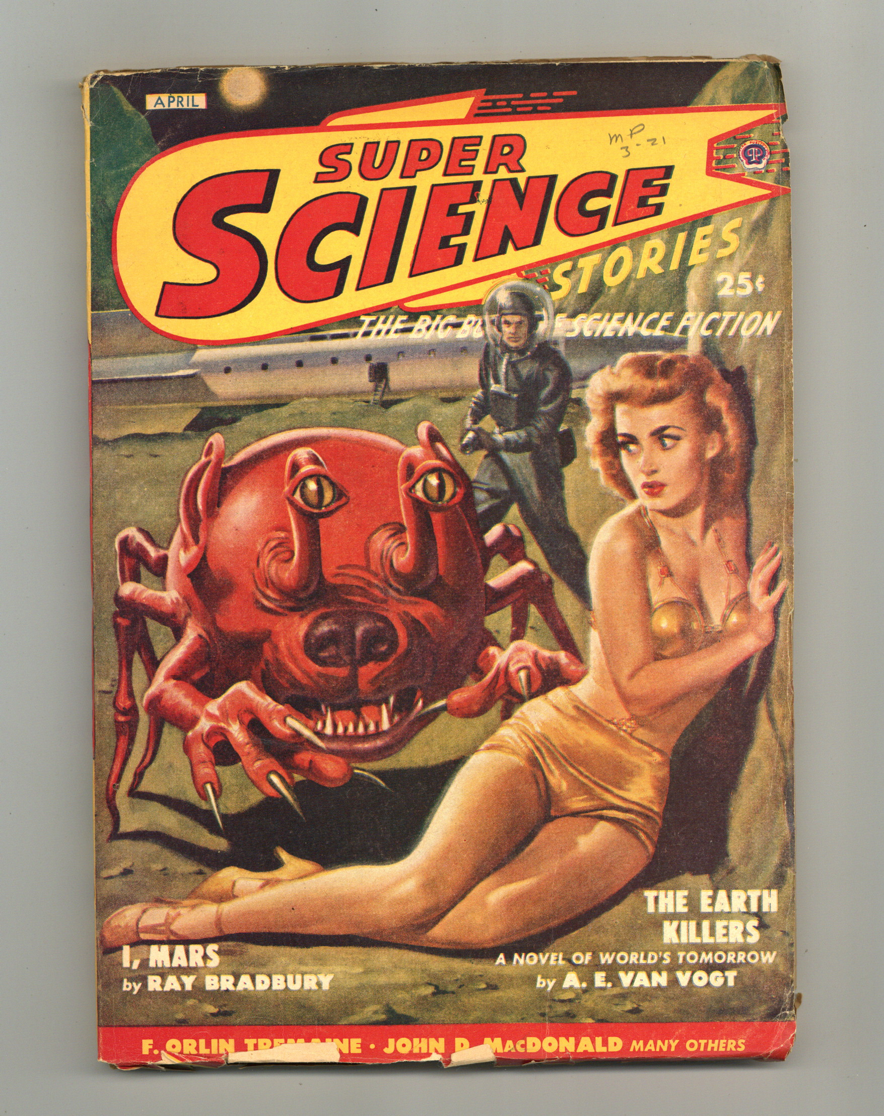 Vol. 5 #2 - April 1949. Short novels "The Earth Killers" by A.E. van Vogt, "Death Quotient" by John D. MacDonald. Novelettes: "Son of the Stars" by Orlin Tremaine, "Dhactwhu - Remember?" by Wilfred Morley. Short Stories: "I, Mars" by Ray Bradbury, "All Our Yesterdays" by John Wade Farrell, "Darkside Destiny" by James MacCreigh, "Delusion Drive" by Peter Reed. Frederik Pohl's Science Fictioneer column. Cover by Lawrence Sterne Stevens. Interior illustrations by Hannes Bok, Stevens, John Giunta, and Frank R. Paul. Letter from Chad Oliver. 7-in. x 10-in. 130 pages, B&W. Cover price $0.25.