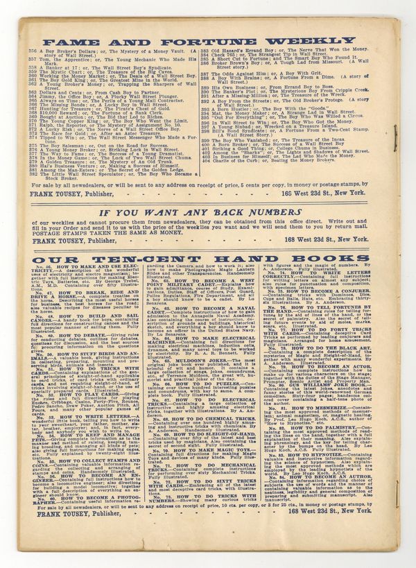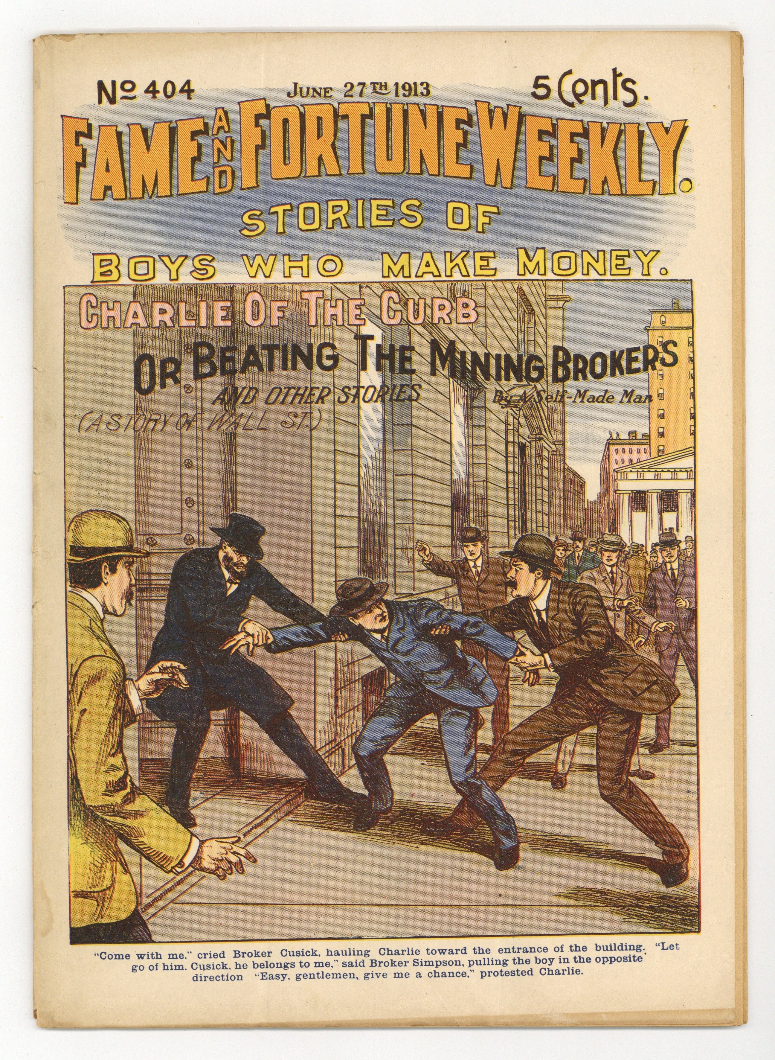 June 27, 1913. Boys Who Make Money. Charlie of the Curb; or, Beating the Mining Brokers. 11" x 8", 36 pages. Cover price $0.05.