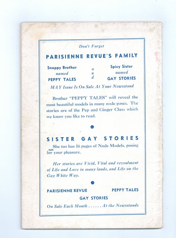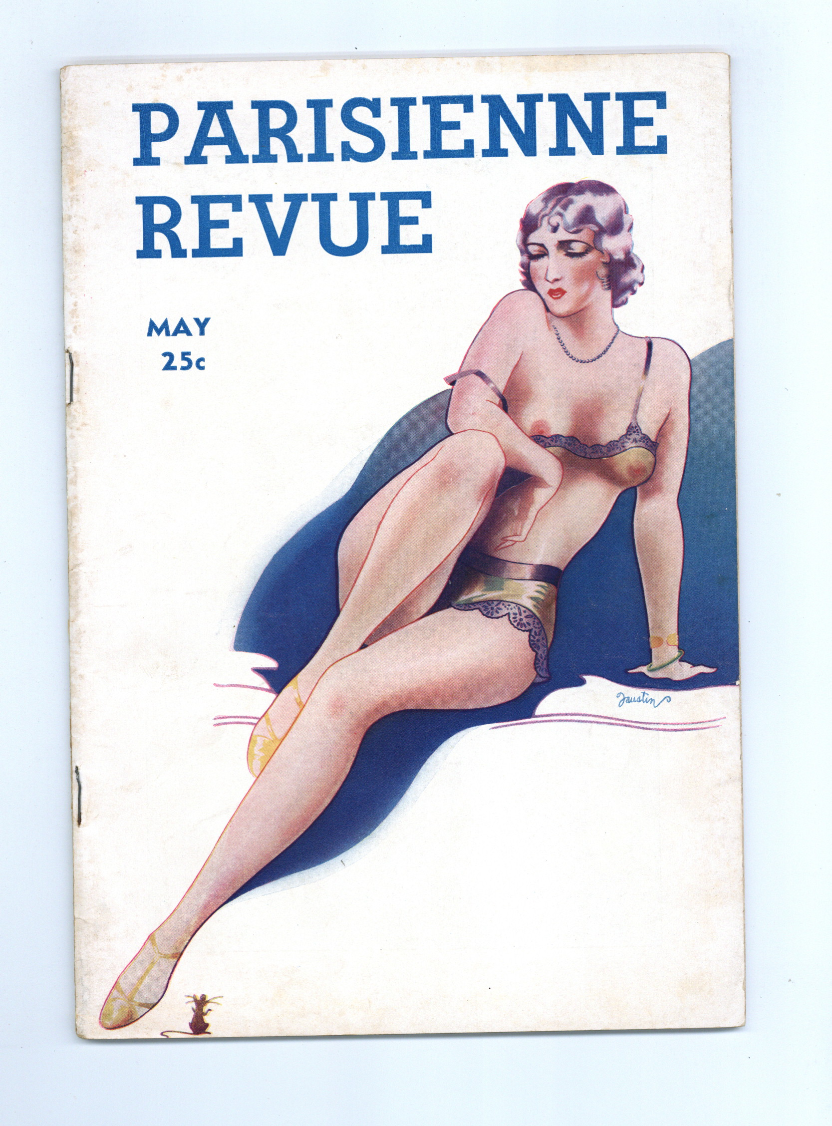 Cover previously used on Paris Nights Vol. 11 #9 and Parisienne Revue Vol. 1 #1. Besides the illustrated fiction, there is a 16-page center section of full page pinups on glossy paper. Uncommon. 6 3/4-in. x 9 3/4-in., 52 pages, B&W. Mature readers. Cover price $0.25.