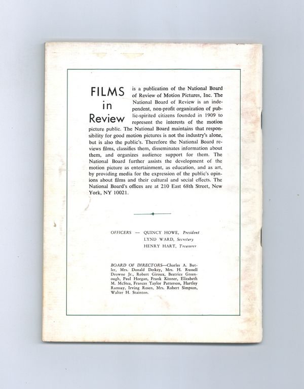 Film in Review is a publication of the National Board of Review of Motion Pictures, Inc, an independent, non-profit organization of public citizens founded in 1909 to represent the interests of the motion picture public. This National Board further assists the development of the motion picture as a source of entertainment, as education, and as art, by providing media for the expression of the public's opinion about films and their cultural and social effects. 5 1/2-in. x 7 1/2-in. Cover price $0.90.