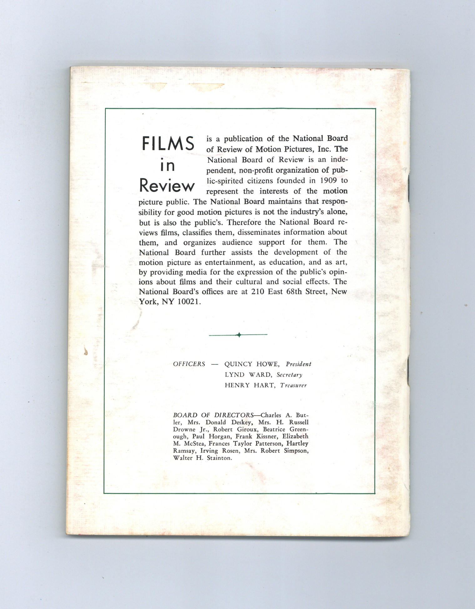 Published Nov 1972 by National Board of Review of Motion Pictures Inc..$5.00- Water damage: Slight. Staple rust: Moderate.