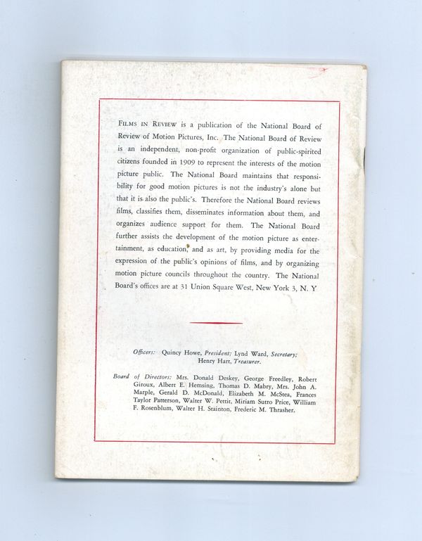 Film in Review is a publication of the National Board of Review of Motion Pictures, Inc, an independent, non-profit organization of public citizens founded in 1909 to represent the interests of the motion picture public. This National Board further assists the development of the motion picture as a source of entertainment, as education, and as art, by providing media for the expression of the public's opinion about films and their cultural and social effects. 5 1/2-in. x 7 1/2-in., 68 pages, B&W. Cover price $0.50.