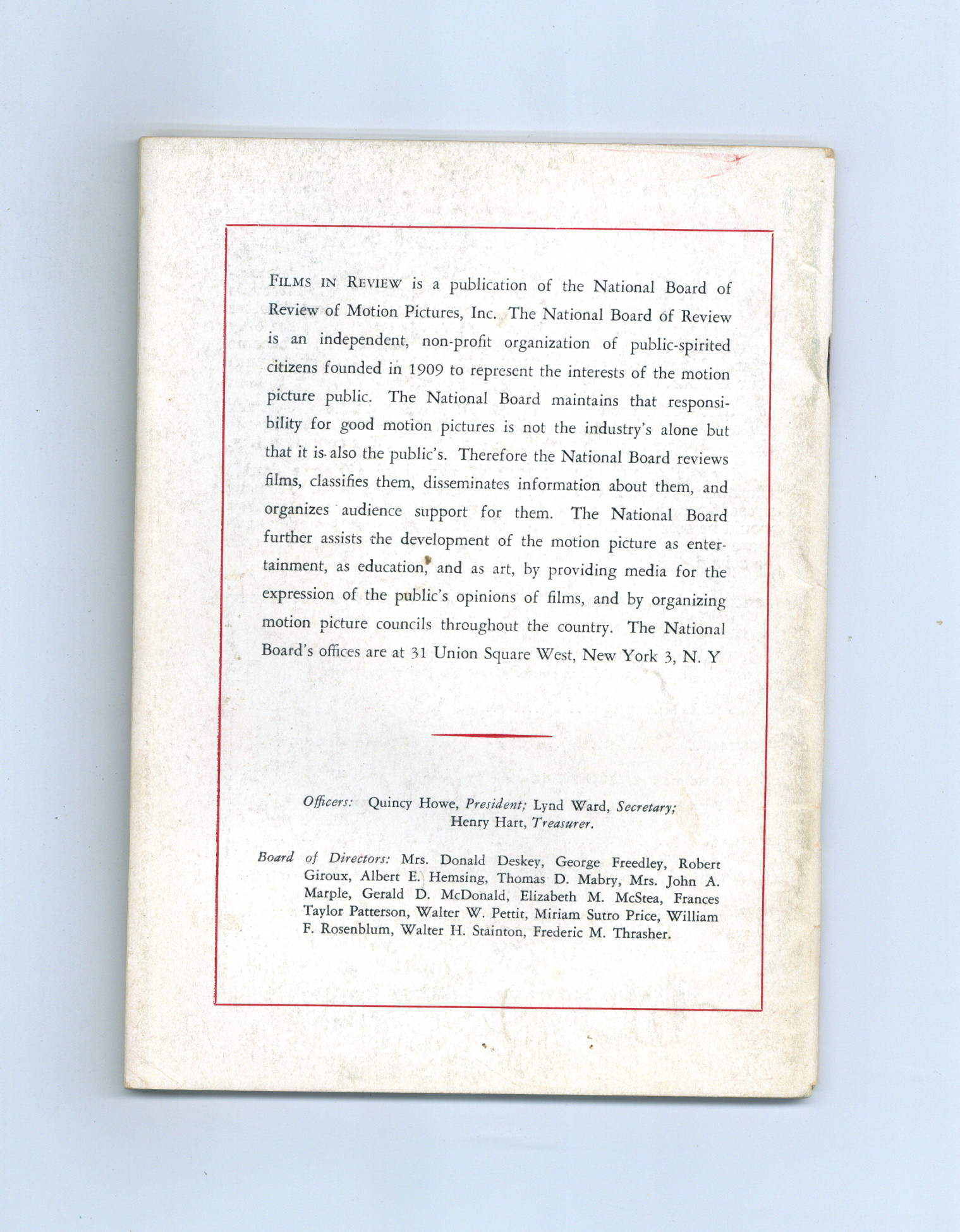 Published Dec 1956 by National Board of Review of Motion Pictures Inc..$10.75- Staple rust: Slight.