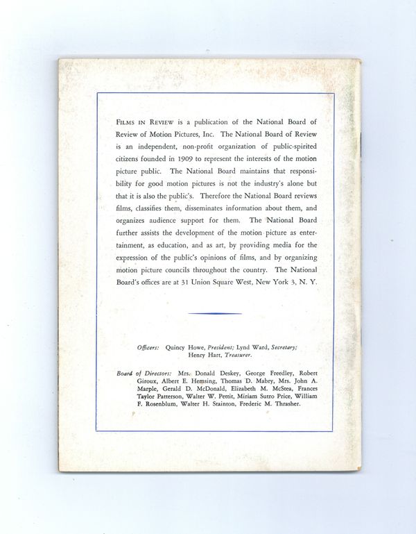 Film in Review is a publication of the National Board of Review of Motion Pictures, Inc, an independent, non-profit organization of public citizens founded in 1909 to represent the interests of the motion picture public. This National Board further assists the development of the motion picture as a source of entertainment, as education, and as art, by providing media for the expression of the public's opinion about films and their cultural and social effects. 5 1/2-in. x 7 1/2-in., 52 pages, B&W.