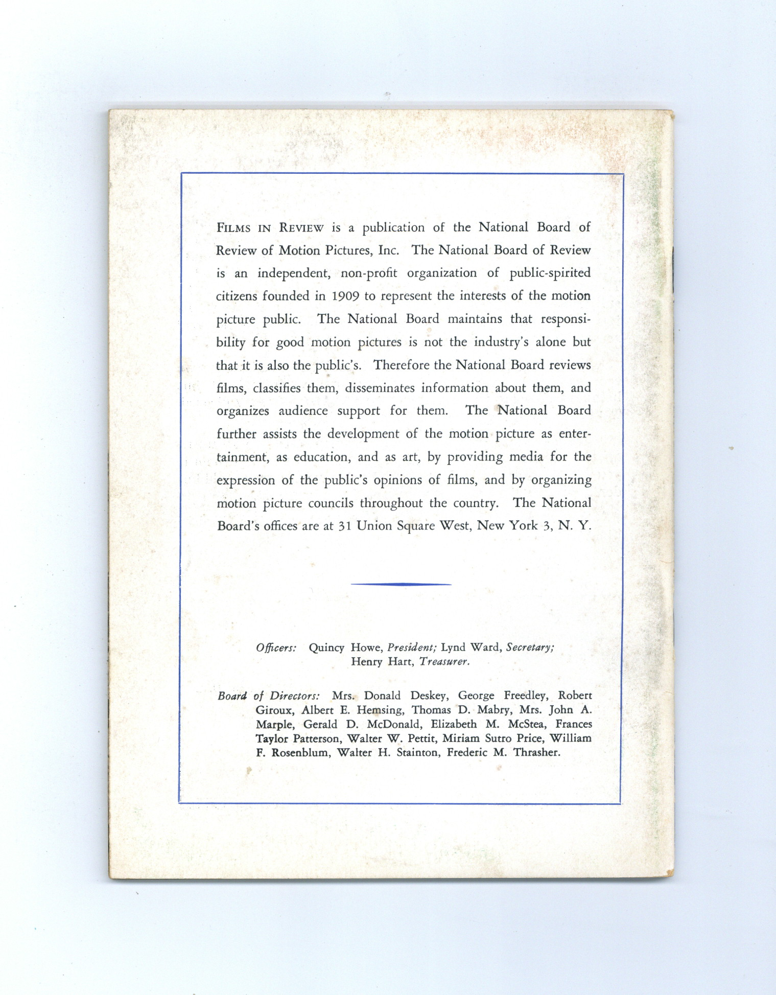 Published Feb 1956 by National Board of Review of Motion Pictures Inc..$10.75- Staple rust: Slight.