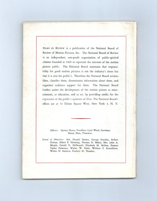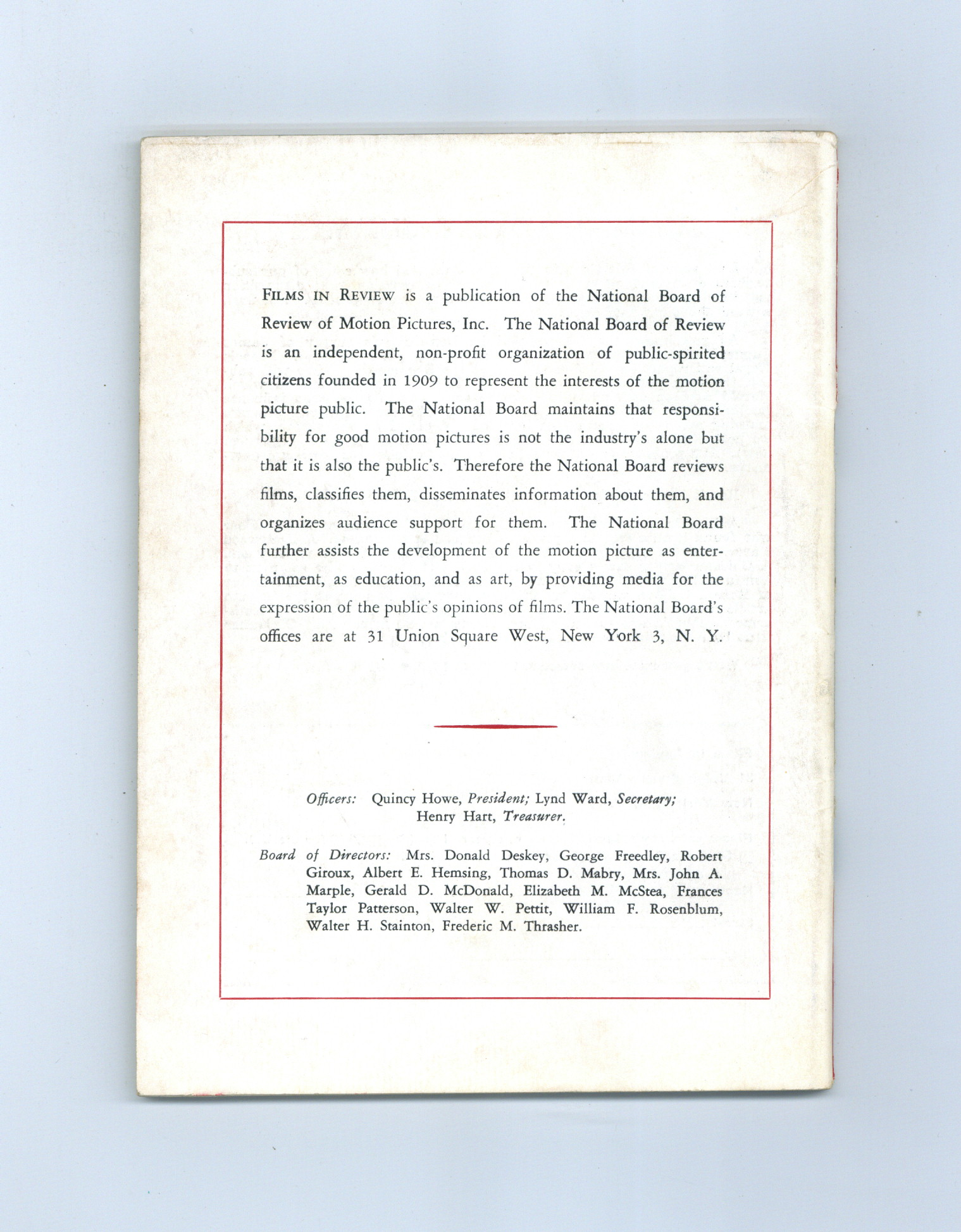 Film in Review is a publication of the National Board of Review of Motion Pictures, Inc, an independent, non-profit organization of public citizens founded in 1909 to represent the interests of the motion picture public. This National Board further assists the development of the motion picture as a source of entertainment, as education, and as art, by providing media for the expression of the public's opinion about films and their cultural and social effects. 5 1/2-in. x 7 1/2-in., 52 pages, B&W. Cover price $0.50.