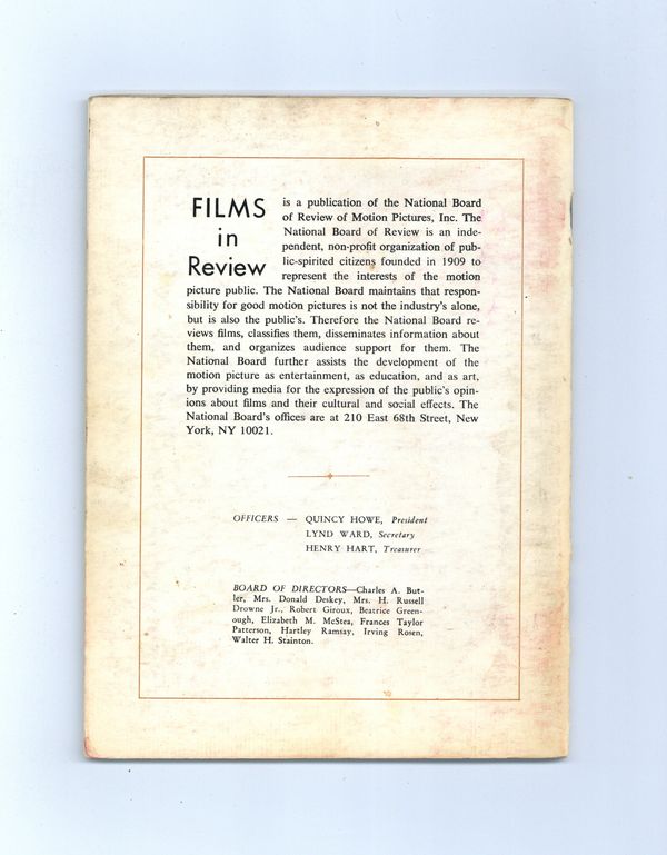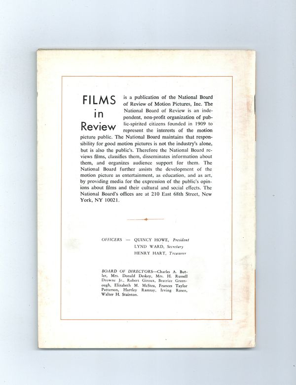 Published Nov 1970 by National Board of Review of Motion Pictures Inc..$5.80Film in Review is a publication of the National Board of Review of Motion Pictures, Inc, an independent, non-profit organization of public citizens founded in 1909 to represent the interests of the motion picture public. This National Board further assists the development of the motion picture as a source of entertainment, as education, and as art, by providing media for the expression of the public's opinion about films and their cultural and social effects. 5 1/2-in. x 7 1/2-in., 64 pages, B&W. Cover price $0.90.