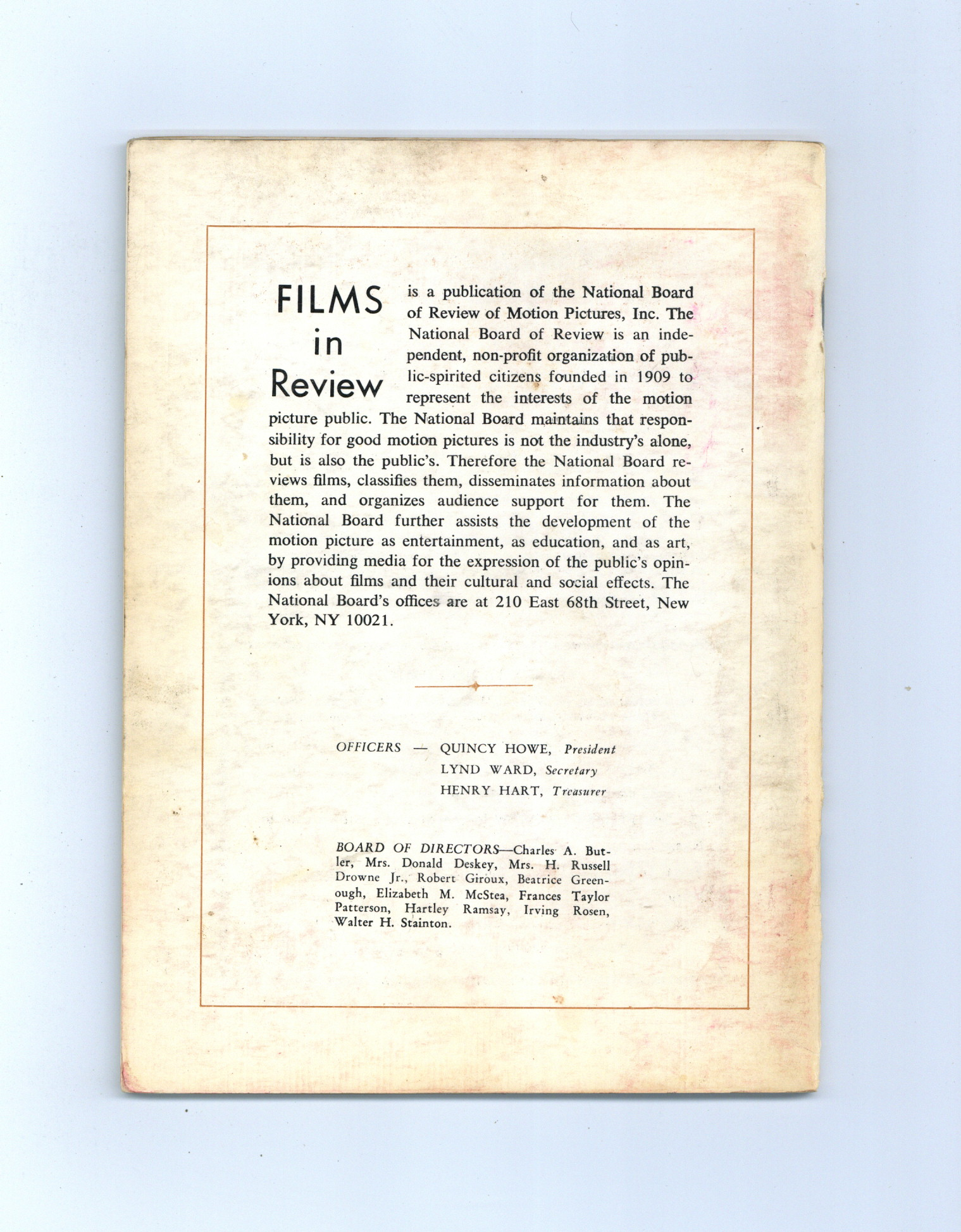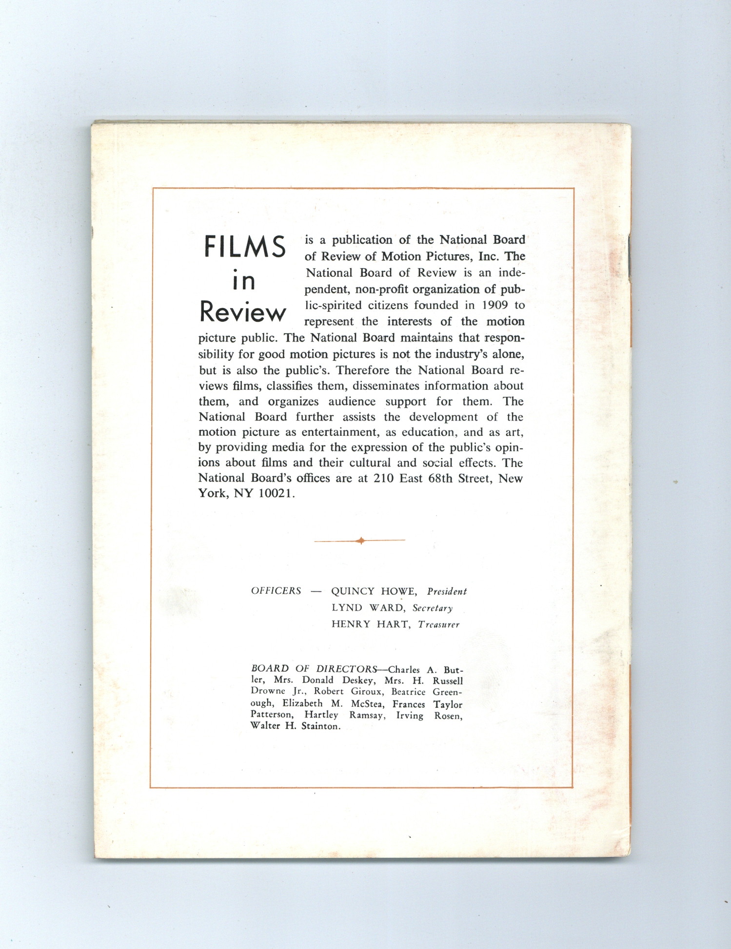 Published Nov 1970 by National Board of Review of Motion Pictures Inc..$9.60Film in Review is a publication of the National Board of Review of Motion Pictures, Inc, an independent, non-profit organization of public citizens founded in 1909 to represent the interests of the motion picture public. This National Board further assists the development of the motion picture as a source of entertainment, as education, and as art, by providing media for the expression of the public's opinion about films and their cultural and social effects. 5 1/2-in. x 7 1/2-in., 64 pages, B&W. Cover price $0.90.