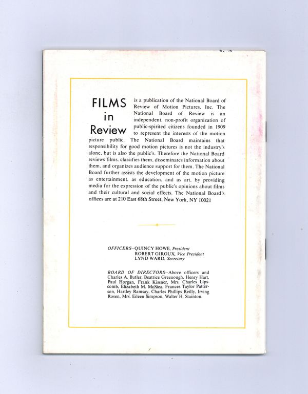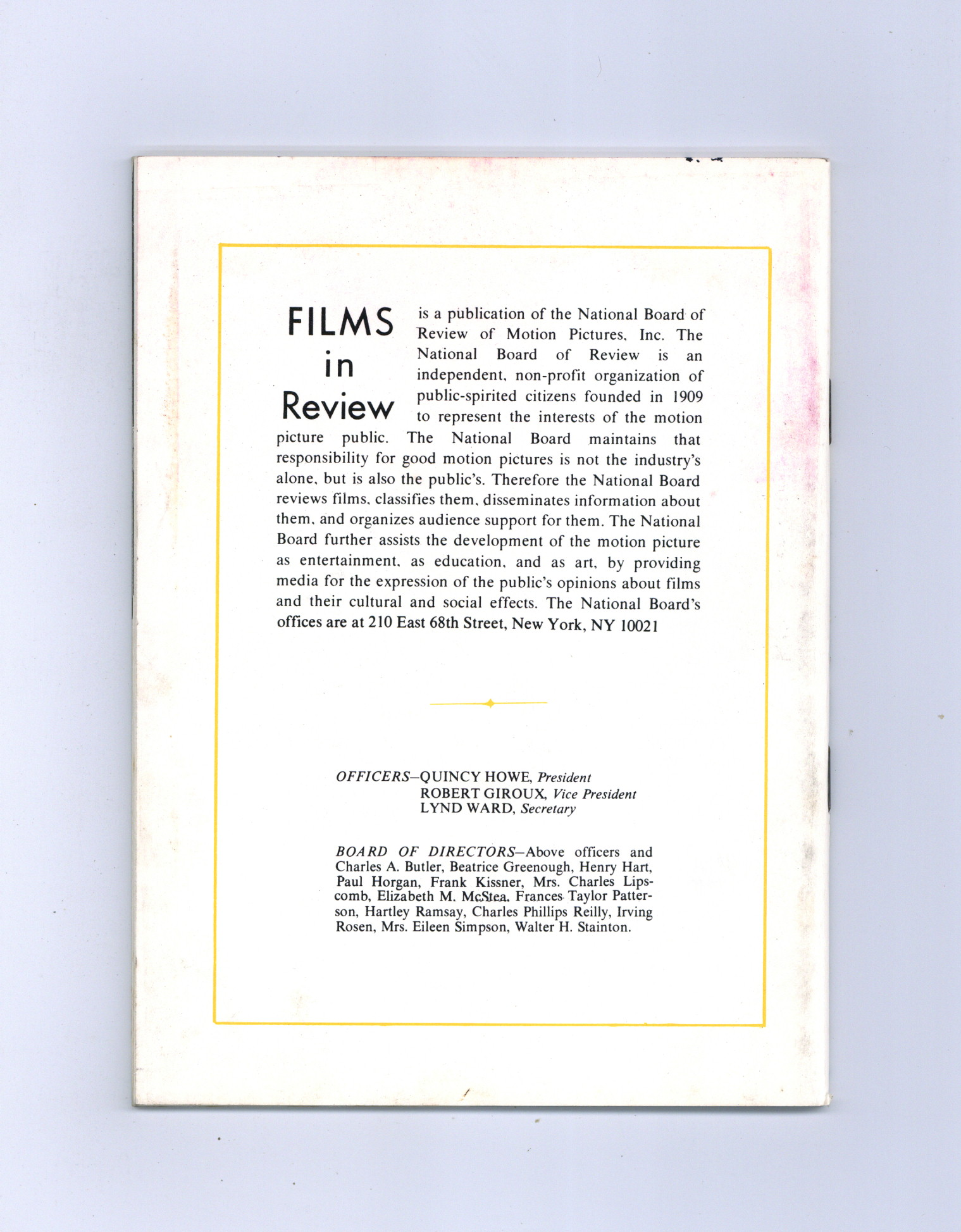 Film in Review is a publication of the National Board of Review of Motion Pictures, Inc, an independent, non-profit organization of public citizens founded in 1909 to represent the interests of the motion picture public. This National Board further assists the development of the motion picture as a source of entertainment, as education, and as art, by providing media for the expression of the public's opinion about films and their cultural and social effects. 5 1/2-in. x 7 1/2-in., 64 pages, B&W. Cover price $1.00.