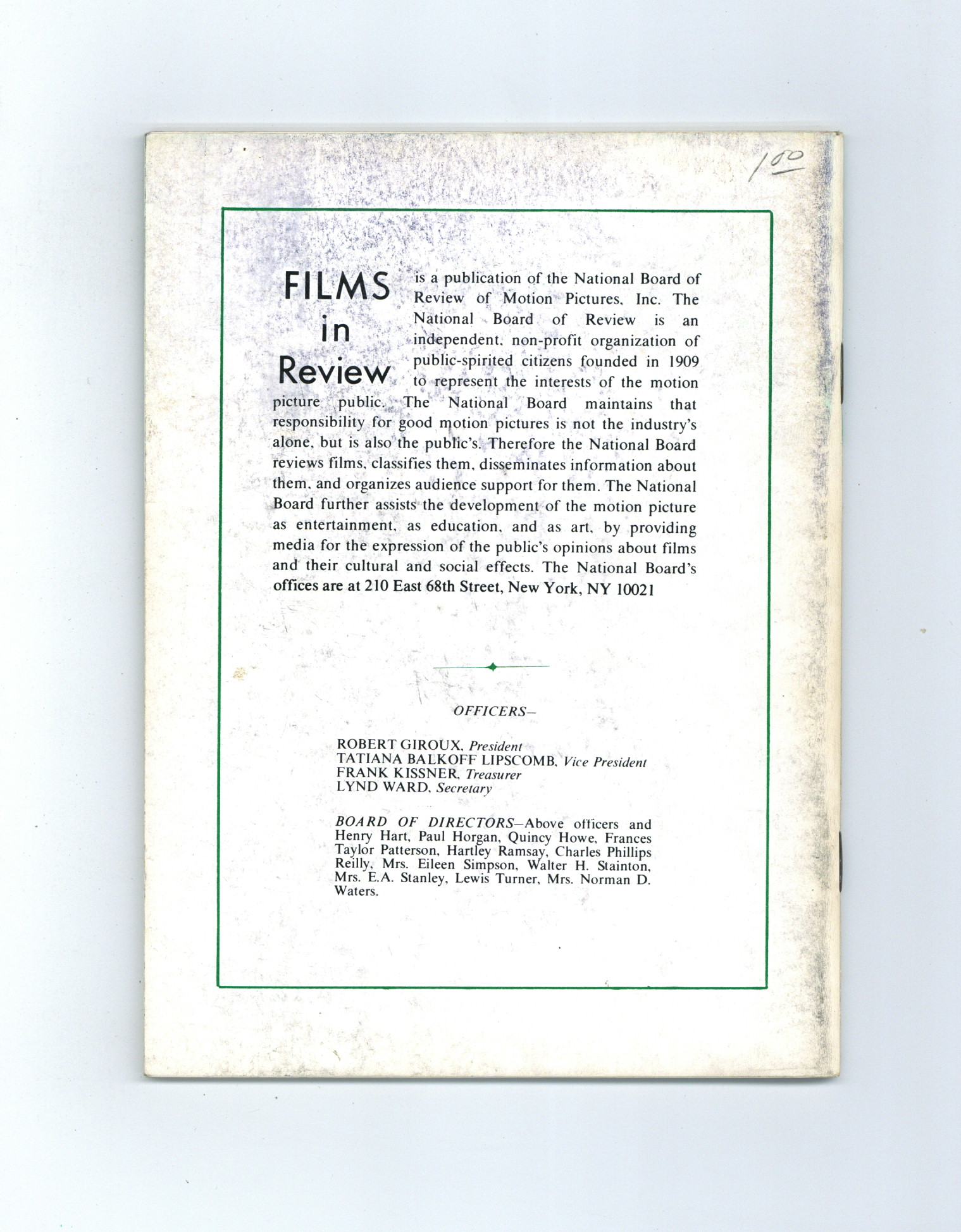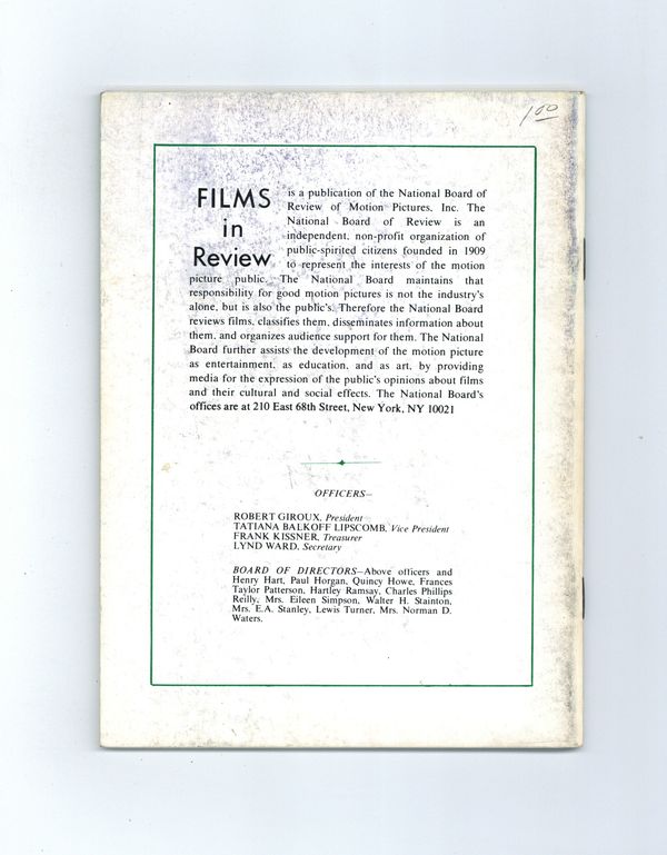 Film in Review is a publication of the National Board of Review of Motion Pictures, Inc, an independent, non-profit organization of public citizens founded in 1909 to represent the interests of the motion picture public. This National Board further assists the development of the motion picture as a source of entertainment, as education, and as art, by providing media for the expression of the public's opinion about films and their cultural and social effects. 5 1/2-in. x 7 1/2-in., 64 pages, B&W. Cover price $1.50.
