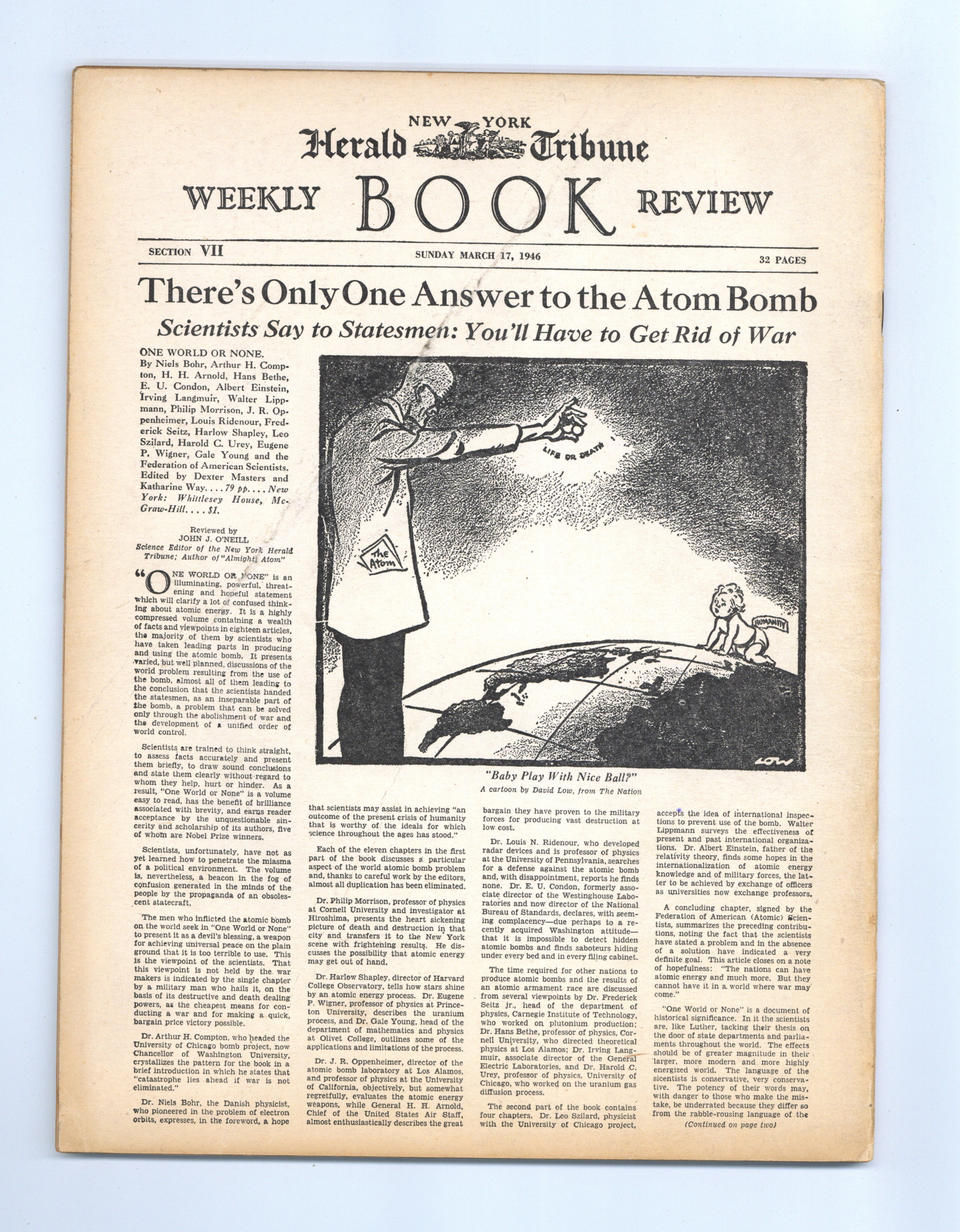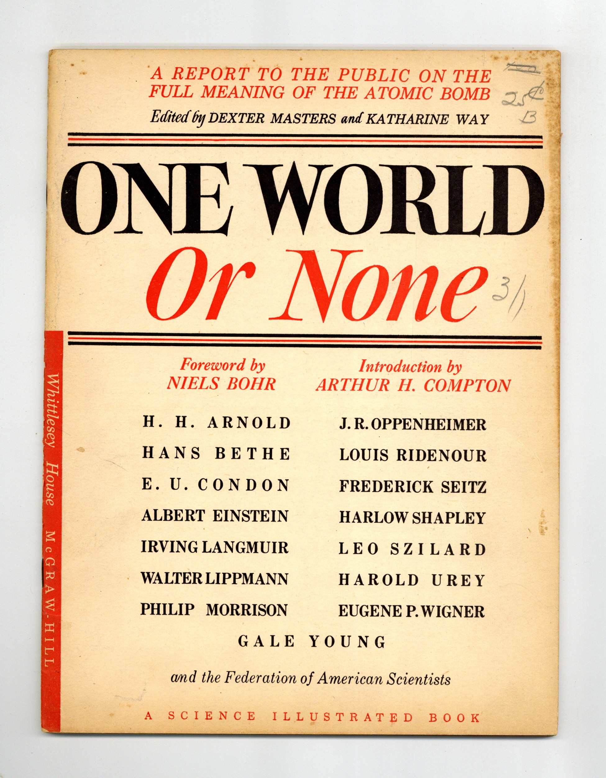 Published 1946 by McGraw-Hill.$10.00One World or None is a collection of letters, essays, and reports made by members of the Manhattan Project after the bombing of Hiroshima and Nagasaki. Notable names include Albert Einstein, Jeffrey Oppenheimer, and Niels Bohr. 82 pages. Cover price $1.00.